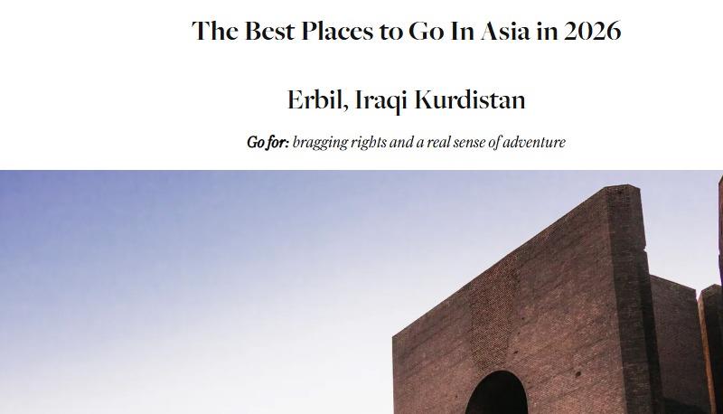بەپێی ڕاپۆرتێکی تایبەتی گۆڤاری گەشتیاریی "کۆندی ناست تراڤێلەر" (Condé Nast Traveler)، شاری هەولێر وەک باشترین شوێنی گەشتیاری لە ئاسیا بۆ ساڵی 2026 دیاری کراوە.