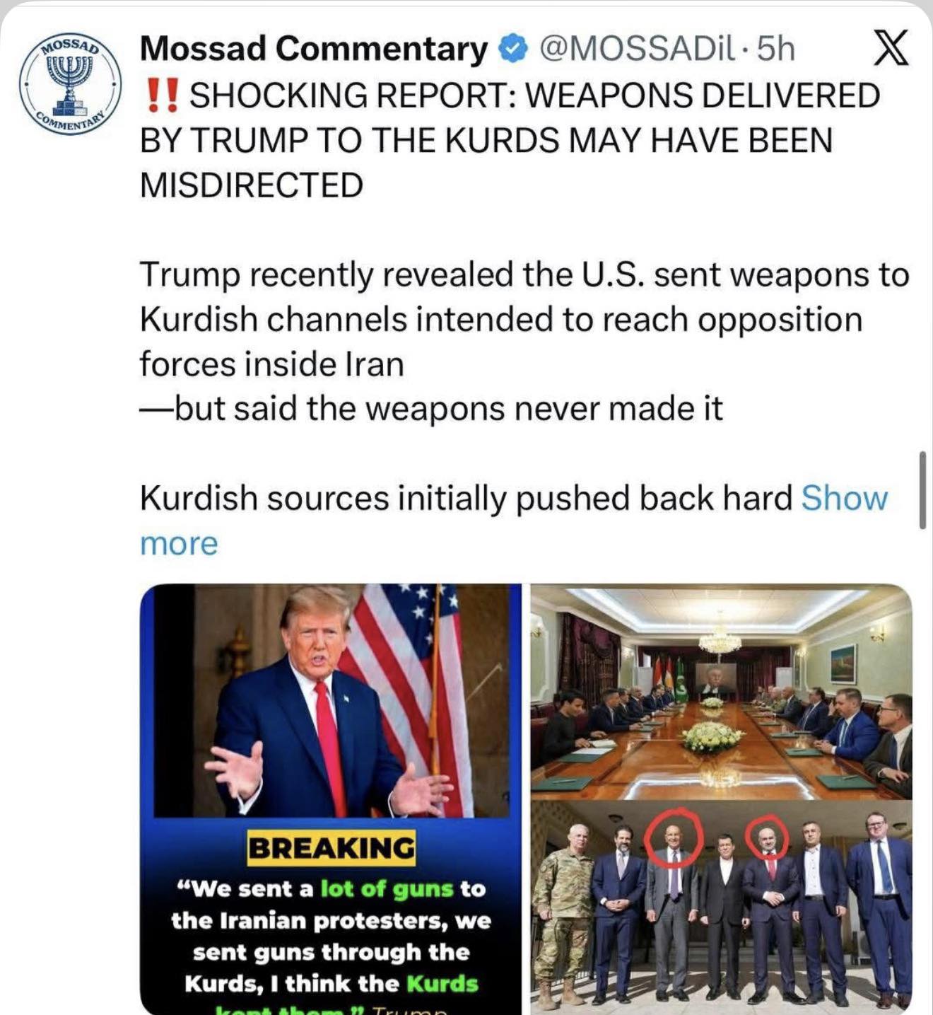 بە ڕوون و رەوانی، لاپەڕەكەی مۆساد نووسیویەتی، ترەمپ لەمدواییانەدا ئاشكرای كرد كە ئەمەریكا چەكی ناردووە بۆ حزبە كوردییەكان بە مەبەستی گەیشتن بە هێزەكانی ئۆپۆزسیۆن لە ناوخۆی ئێران، بەڵام نەگەیشتن و پێدەچێ ئەو حزبەی بۆی نێردراوە چەكەكانی لای خۆی گل دابێتەوە.