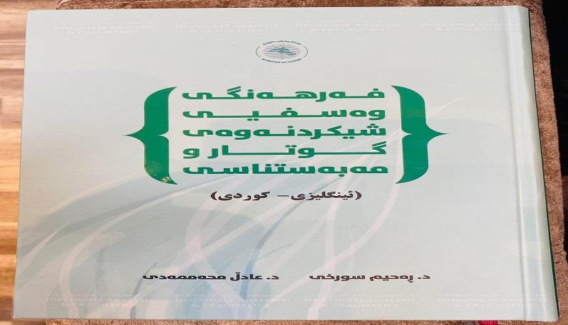 فەرهەنگی وەسفیی شیكردنەوەی گوتار و مەبەستناسی ئینگلیزی ـ كوردی، د. ڕەحیم سورخی و د. عادل محەمەدی نووسیویانە، ئەكادیمیای كوردی چاپی كردووە  و ئێستە لە كتێبخانەكان بەردەستە.