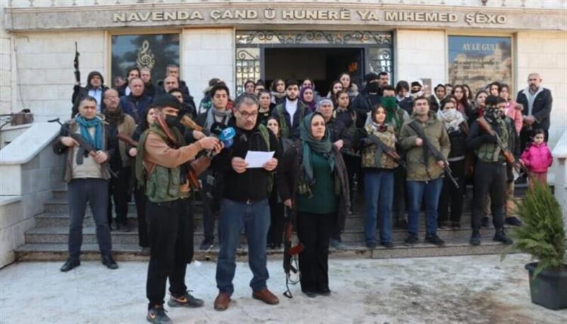 تەڤگەری كولتوور و هونەری دیموكراتیكی میزۆپۆتامیا و تەڤگەری كولتووری ژنانی هیلالی زێڕین، دەستەی كولتوور و ڕۆشنبیری كانتۆنی جەزیرە، ئەنجوومەنی ئەدەبی و یەكێتیی هونەرمەندان بە بەشداریی هونەرمەندان، ڕۆشنبیران، نووسەران و شاعیرانی ڕۆژئاوای كوردستان، هەروەها نوێنەرانی ئەنجوومەنی خۆبەڕێوەبەری دیموكراتیكی كانتۆنی جەزیرە بڕیاریان دا چەك هەڵبگرن.
